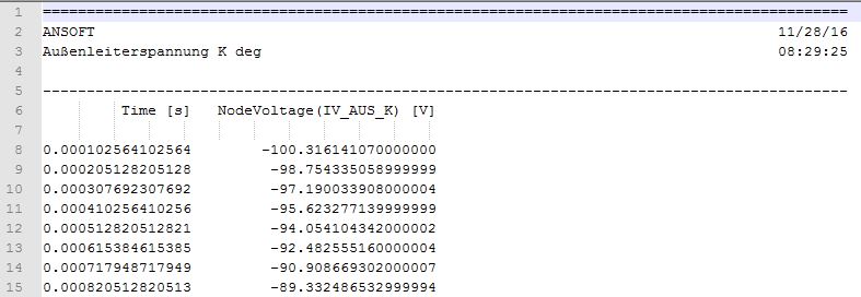 danke schon mal für deine Antwort. Das txt.-file wird von Ansys Maxwell erstellt und sieht aus wie im angehängten jpg zu sehen. Zudem ist dort auch die Darstellungsweise der Daten zu sehen. Es gibt zwei Spalten: Erste Spalte die Zeit, zweite Spalte wie hier z.B. eine Spannung in Volt. Ich brauche davon eigentlich nur die Spannungswerte für einen bestimmten Bereich.