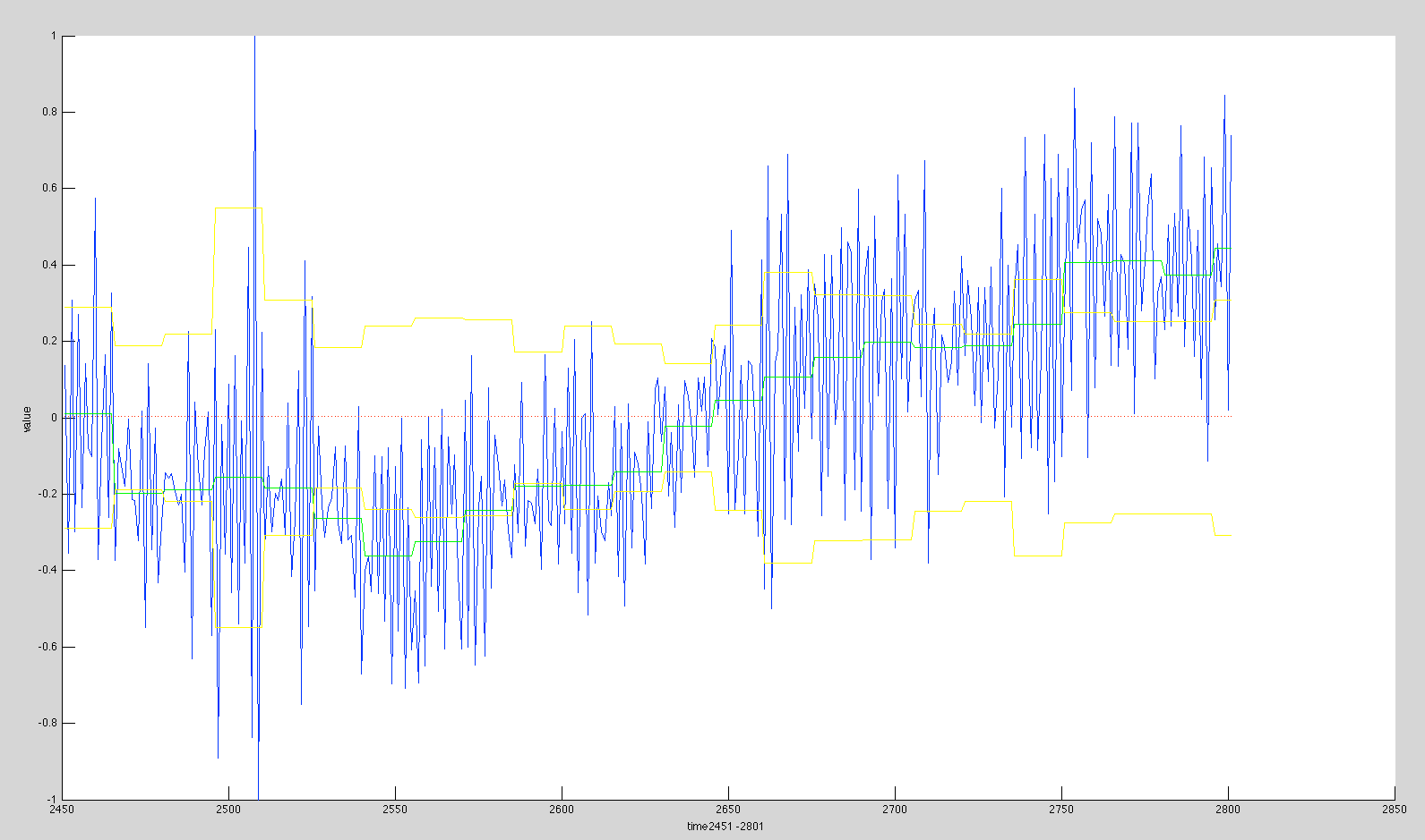 gelb +/- Standardabweichung über das selbe Fenster, rot der Mittelwert über das gesamte Signal.