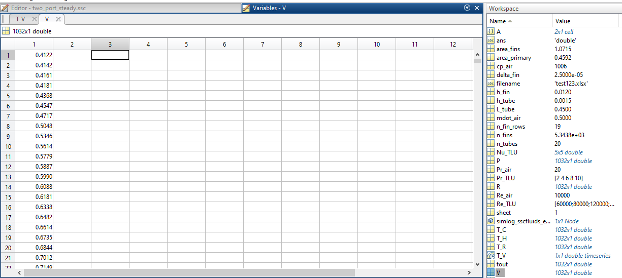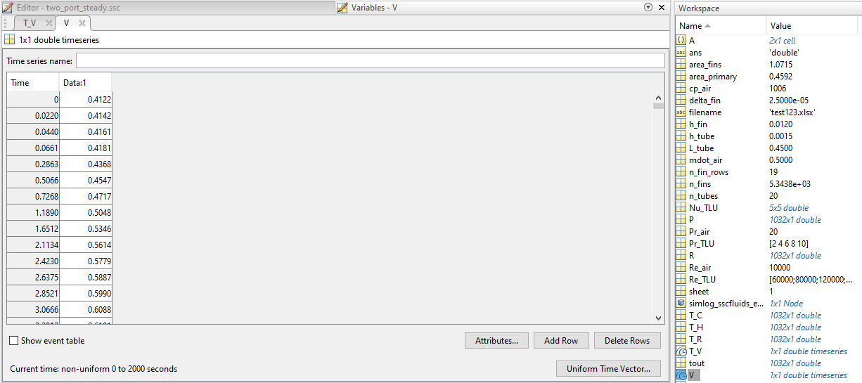 Der "To Workspace"-Block in Simulink übergibt die Variable standardmäßig als Timeseries ans Workspace. Meine erzeugte Variable V ist also eine 1x1 double timeseries Variable und beinhaltet Zeit und die Werte (Volumenstrom). Soweit so gut.