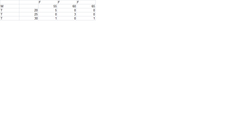 Deine Tabelle ist nicht lesbar. Versuche sie als Code zu formatieren. Vielleicht wird dann klar, was Du meinst und was M, T und F bedeutet.