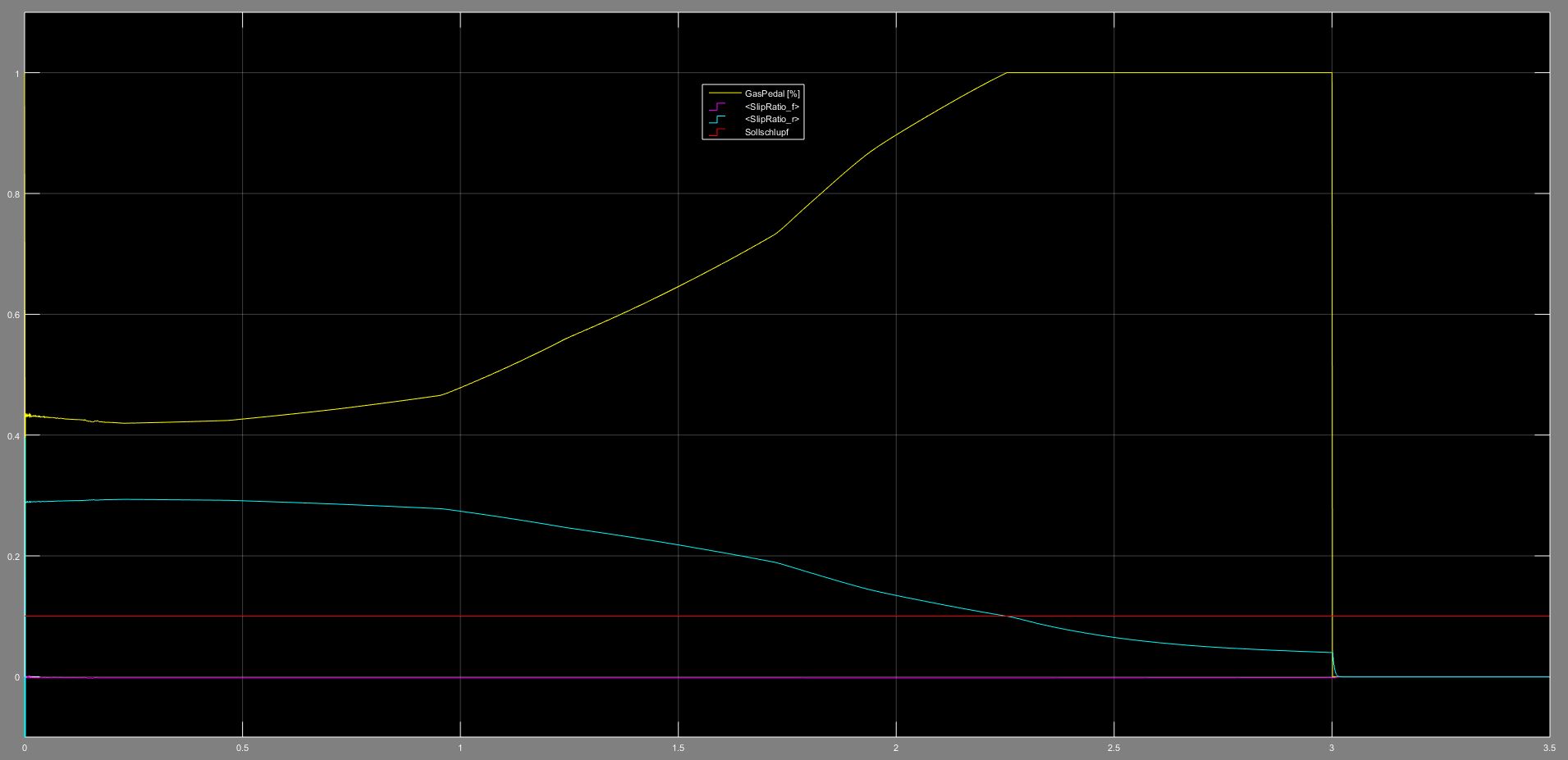 Ich habe mal die Ergebnisse der Schlupfregelung für verschiedene Solver angehaben. - Wobei Schlupfregelung hier etwas zu hochgegriffen ist: Der Betrachtete Regler, soll nur den Gasfuß des Fahrers darstellen, der vom Gas geht, wenn er merkt, dass die Räder zu viel schlupfen. Daher ist eine gewisse Abweichung des Schlupfes hier erlaubt.