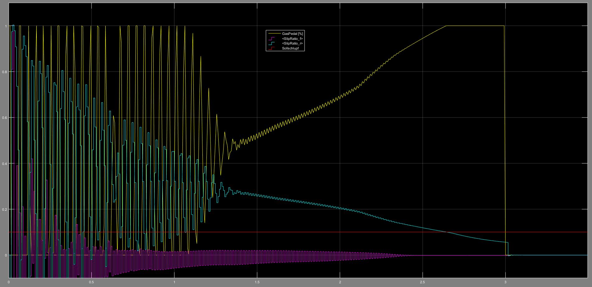 Die Simulation verfügt über eine simple Antriebsschlupfregelung, welche den Schlupf auf einen Zielwert durch Beeinflussung des Motormoments regelt. Mit variable step size funktioniert das auch super, mit der erwähnten fixed step size fängt der Schlupf jedoch unglaublich stark an zu schwingen.