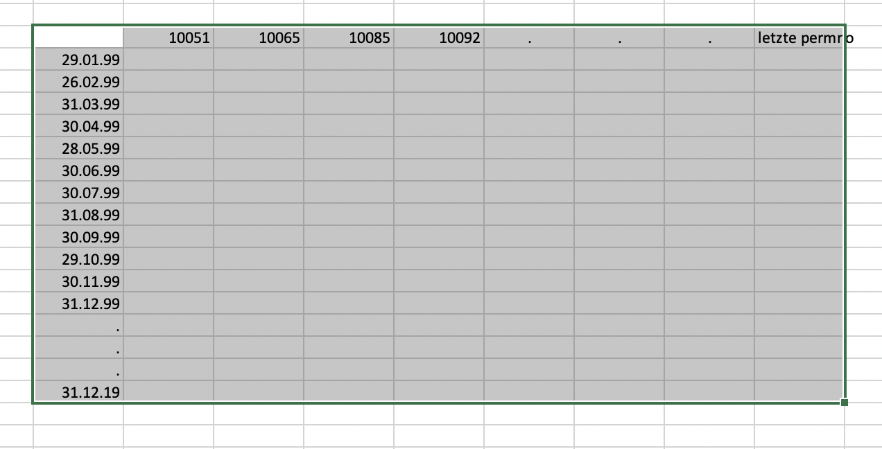 Das Problem ist, dass bei manchen permno Monate komplett fehlen. Also nicht nur die returns zu den monaten, sondern der Monat an sich ist nicht aufgeführt (zB. für die permno 10051 fehlen die returns zu den Monaten Feb 16 bis Jan 18 aber die Monate Feb 18 bis Sep 18 sind gar nicht aufgeführt). Meine Betreuerin meinte "du kanst die jeweiligen Daten für 1 Unternehmen immer an eine vollständige Datumsreihe mergen. Dadurch entstehen automatisch Lücken bzw. NaNs wenn es keine Daten zu einem Monat gibt". Nur weis ich leider nicht wie das geht