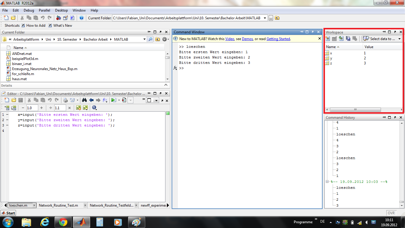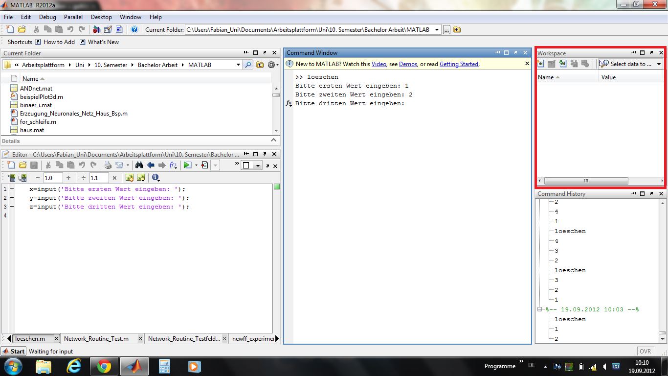 | die Variablen samt ihren zugehörigen Werten werden erst im workspace angezeigt, nachdem der letzte Wert eingegeben und die .m-file beendet wurde. |