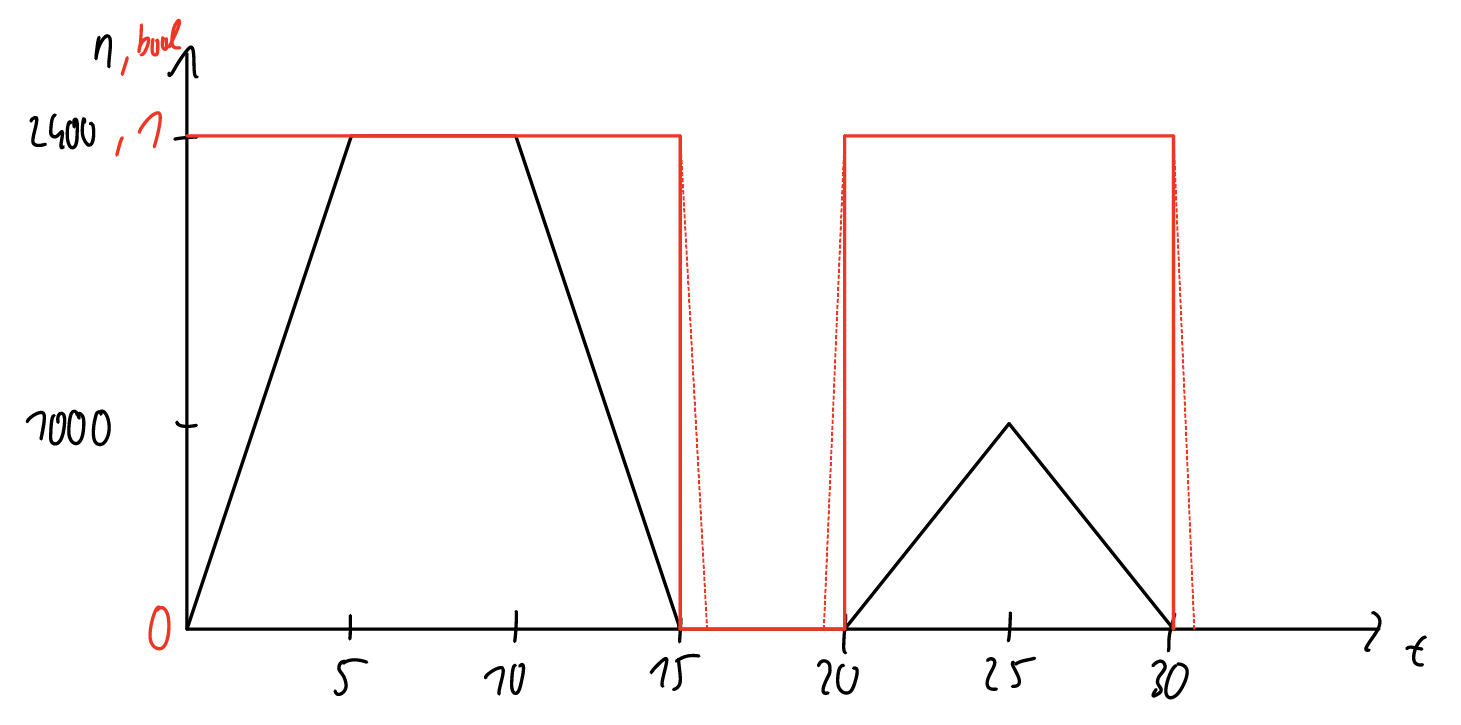 Natürlich kann ich nicht einfach sagen: wenn n = 0, dann bool = 0 usw., weil dann bekomme ich den gleichen Verlauf wie bei der Drehzahl. Die Senkrechten, wie im Bild zu erkennen, sind mir nicht wichtig. Mir ist nur wichtig das bei bspw. t=15s, bool = 1 ist. Ich habe mir überlegt, Zwischenzeiten einzufügen, bspw. 15,0001s, um das zu realisieren (gestrichelte rote Linie im Bild).