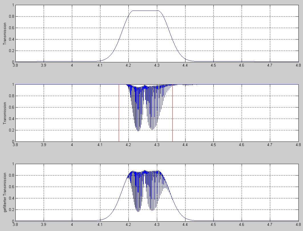 Jetzt soll der reelle Filter genutzt werden (Plot 1). Das Egebnis ist ja der dritte Plot. Daraus will ich jetzt den Transmissionskoeffizient bestimmen. Der ideale Filter lag bei 0,9 und beim reellen müsste es vielleicht bei 0,7 liegen.