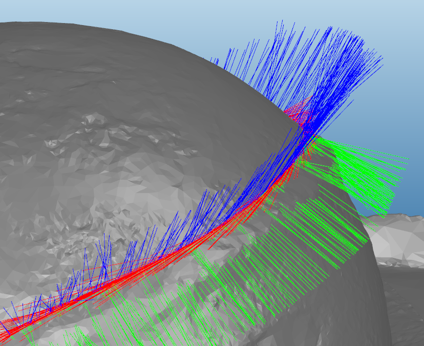 Dadurch das die Fläche grob facettiert ist kommt es zu dem Effekt, dass die Vektoren entlang der Kontur stark zittern. Ziel ist es jetzt den Verlauf der Vektoren zu glätten, so dass sich ein harmonisches Verlauf ergibt. Wichtig hierbei ist das nicht nur der Z-Vektor geglättet werden muss sondern auch X-Vektor welcher der Bahntangentialen folgen muss. Beide müssen im Rechten Winkel zueinander stehen. der Y-Vektor wird über das Kreuzprodukt abgeleitet.