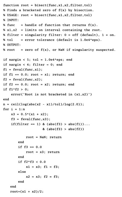 % INPUT: % func = handle of function that returns f(x) % x1, x2 = limits on interval containing the root % filter = singularity filter; 0 = off (default), 1 = on % tol = error tolerance (default is 1.0e4*eps) % OUTPUT: % root = zero of f(x), or NaN if singularity suspected