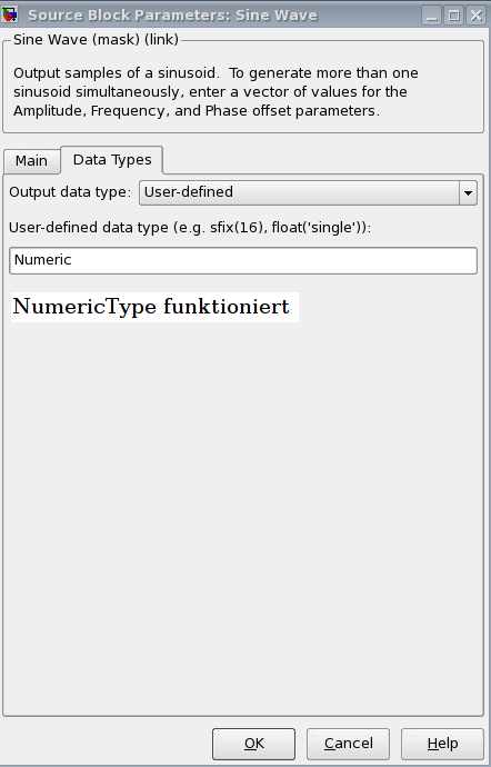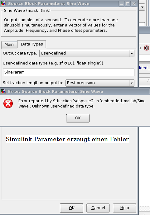 In meinem Modell verwende ich einen Sine Wave Source Block. Als Datentyp verwende ich Fixed-Point. Wenn ich in die Felder für "Word length" und "Fraction length" SineParam (Variable vom Typ Simulink.Parameter) einsetze, dann bekomme ich eine Fehlermledung. Verwende ich allerdings einen NumericType, dann funktioniert es (siehe Screenshots: parameter_error.png, NumericType.png). Leider habe ich auch keine Beispiele gefunden, für welchen Einsatzzweck diese Typen gedacht sind.