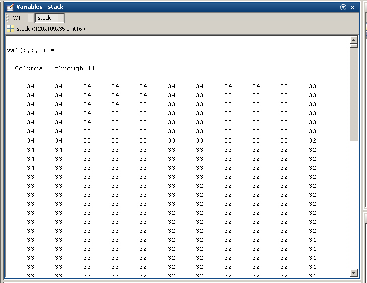 In IgorPro konnte man bei tabellarischer Ansicht durch Knopfdruck von einer Ebene zur nächsten wechseln und somit einzelne Voxel eines 3D-stacks direkt bearbeiten.