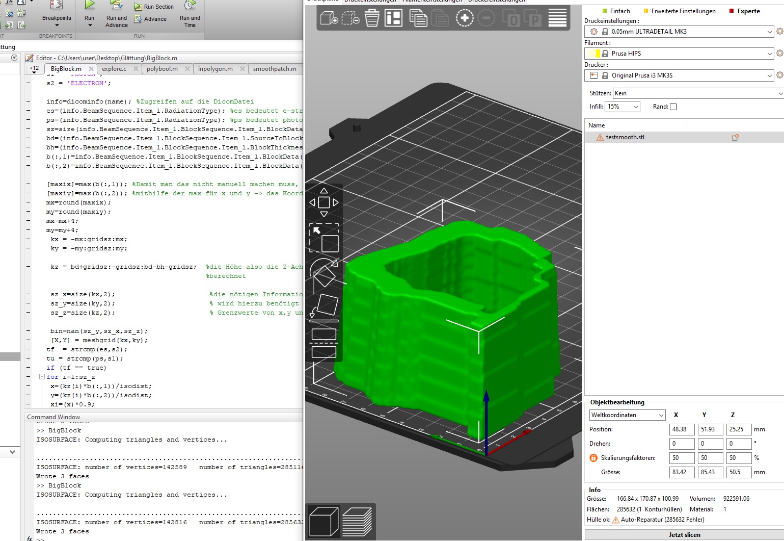 Oberfl=smoothpatch(Oberfl,1,5,1,1) subplot(1,2,2), patch(Oberfl,'FaceColor',[101],'EdgeAlpha',0); view(3); camlight;