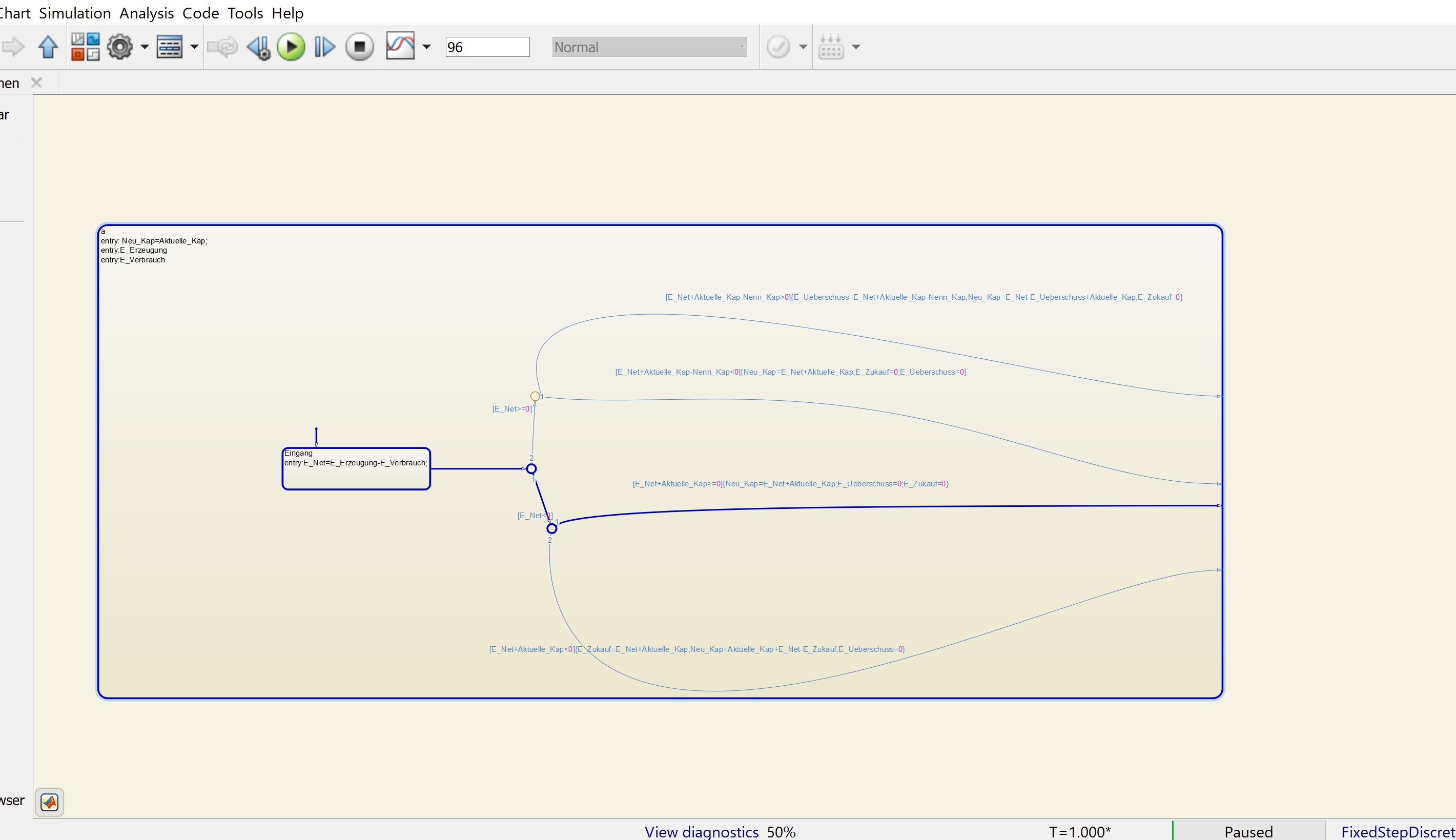 für unser Studienprojekt sollen wir die Kombination einer PV-Anlage mit einem Batteriespeicher simulieren. Nun wollen wir per Stateflow einen Zustand gleichzeitig mit den darauffolgenden Vorgängen ablaufen lassen und in einem Graphen darstellen lassen. Im Anhang seht ihr die Problematik