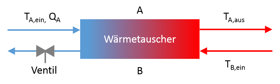 Messtechnisch erfassen kann ich die Eintrittstemperaturen beider Seiten (Störgrößen), den Volumenstrom der Seite A sowie die Austrittstemperatur der Seite B (Regelgröße). Eine Skizze ist im Anhang zu finden.