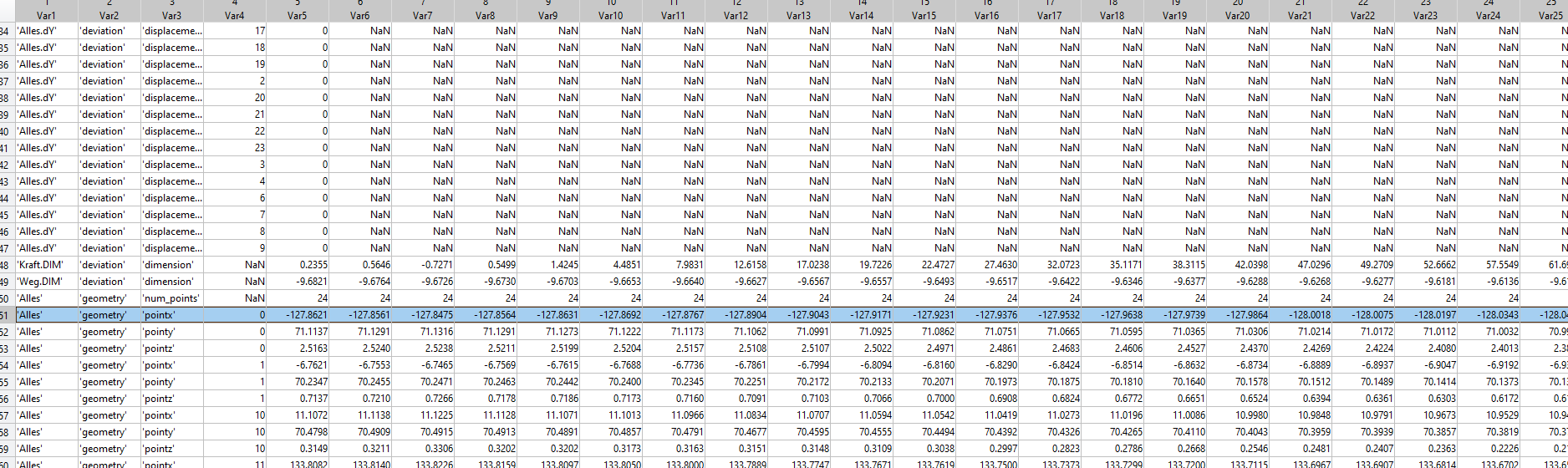 Und zwar möchte ich die Werte bspw. aus der Zeile 51 als eine Variable point_x_0 in einer Tabelle zusammenfassen. Mein Gedanke war finde die Wörter 'Alles', 'geometry','pointx' und den Wert '0' und sage mir welche Werte ab der Spalte 5 bis Spalte 845 in der Zeile 51 vorliegen.