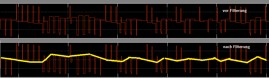 ich bekomme ein Messsignal (siehe unten, oberer Graph). Wie man sieht, sind da ziemlich hohe Flanken dabei, die ich weg bekommen möchte. Ausgangssignal soll dann die gelbe linie sein (unterer Graph).