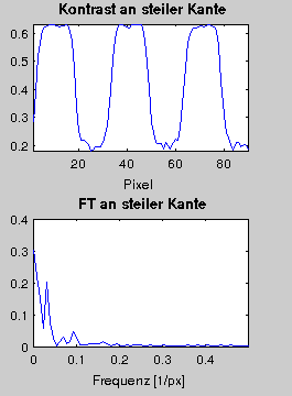 Man sieht eine "Hauptperiode" von etwa T=30px, also hätte ich bei f=1/30=0,03 etwas erwartet und dort liegt auch der zweite Peak. Entsteht der Wert bei 0 aufgrund des endlichen Signals->~Periode->infty; f->0?