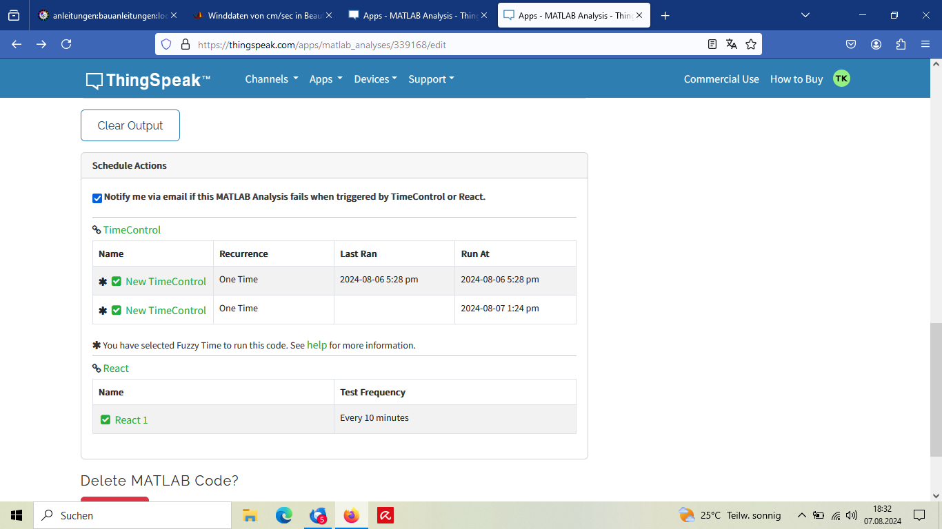 Interessant finde ich, dass die Zeitpunkte für die beiden unteren Plots nicht übereinstimmen. Meine ThingSpeak-Kenntnisse reichen nicht um zu beurteilen, ob das zu erwarten ist.
