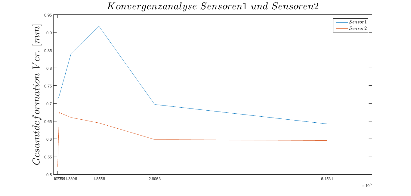 plot(x,z) plot(x,q) title('$Konvergenzanalyse~Sensoren1~und~Sensoren2$','Interpreter','latex','fontsize',25) ylabel('$Gesamtdeformation~Ver.~[mm]$','Interpreter','latex','fontsize',25) set(gca,'xtick', [107722110637133062185575290629615311])