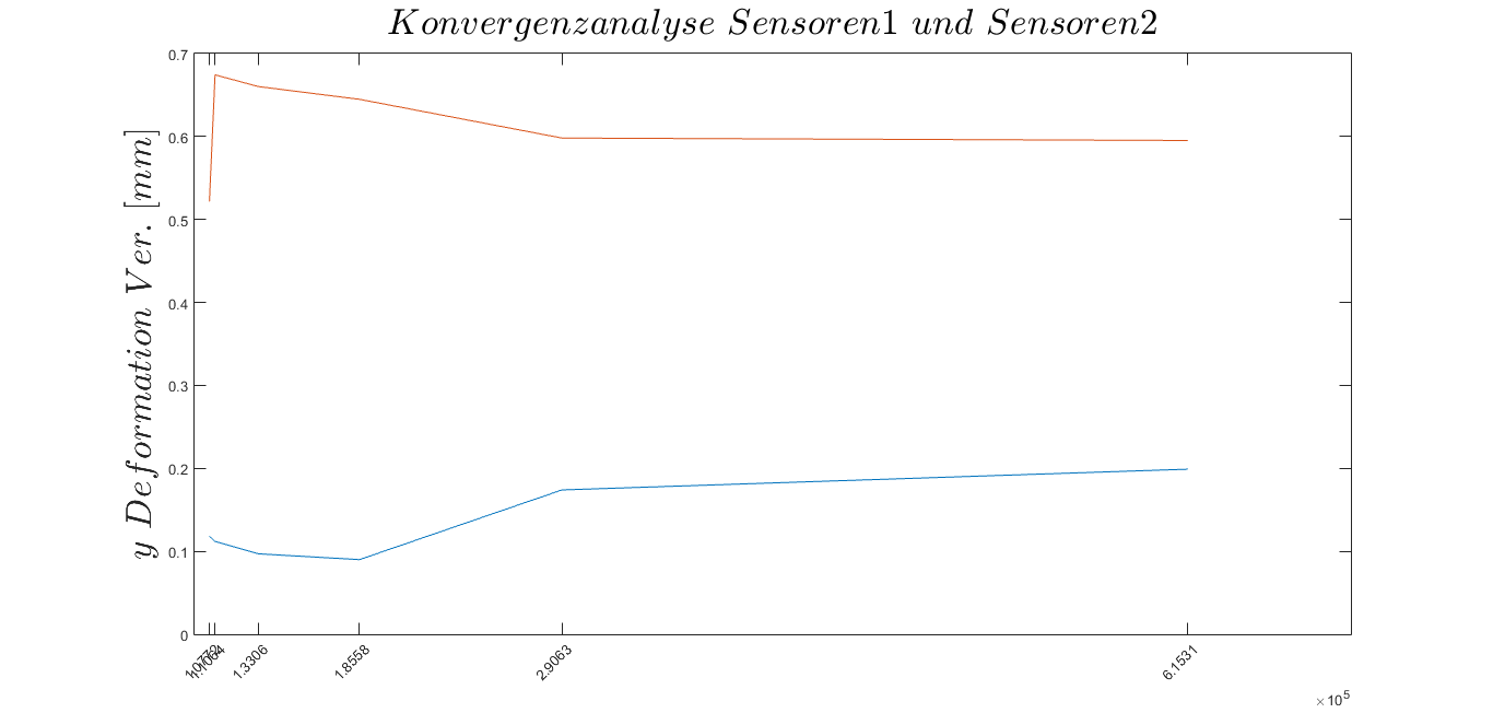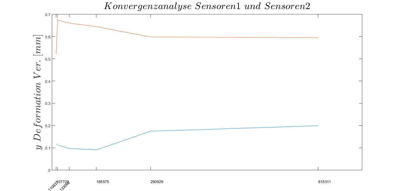 plot(x,z) plot(x,q) title('$Konvergenzanalyse~Sensoren1~und~Sensoren2$','Interpreter','latex','fontsize',25) ylabel('$y~Deformation~Ver.~[mm]$','Interpreter','latex','fontsize',25) set(gca,'xtick',x,'xticklabel',{'107722','','133062','','',''})