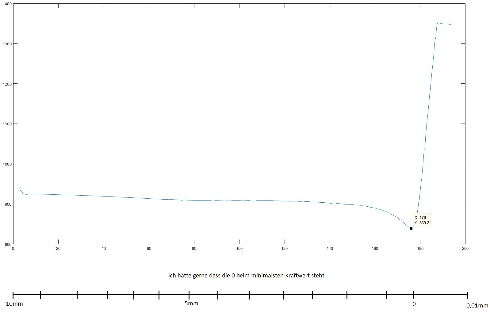 bei meinem Versuch verfahre ich eine Platte, die auf einer Waage steht und diese steht widerum auf einem Hubtisch, um sehr kurze Distanz nach oben oder unten um die Anziehungskraft zu bestimmen. Gegenüber der Platte befindet sich eine weitere Platte (Kondensator) und lege Spannung an. Ich messe das Gewicht(y-Achse) über die Zeit(x-Achse). Da ich weiß wie schnell ich die Platte verfahre, würde ich gerne den Verfahrweg anstatt der Zeit als x-Achse "nehmen". Im Anhang befindet sich eine Abbildung meiner Kraftmessung. Bei der Kraftmessung taucht ein Minimum der Kraft auf. Bei diesem Minimum würde ich gerne den Verfahrweg auf x=0 setzen. Ein Beispiel der Skalierung, wie ich sie gerne haben würde, befindet sich auch in der Abbildung.