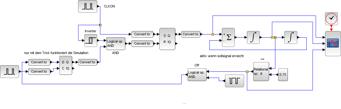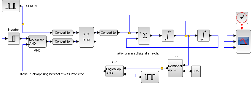 * Die Rückkopplung funktioniert prinzipiell. Z.B. mit einem Integrator und keiner Addition am Eingang. Ich schließe dadraus, dass die Simulation ein Problem durch die doppelte Rückkopplung bekommt.