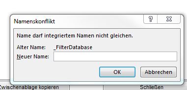 Neulich habe ich jedoch mit einer englischen Excel-Version gearbeitet und los ging das Drama: Es gab keine Fehlermeldung aber eine Eingabeaufforderung "Name darf integriertem Namen nicht gleichen; Alter Name: _FilterDatabase; Neuer Name: (Vom Nutzer einzugeben)".