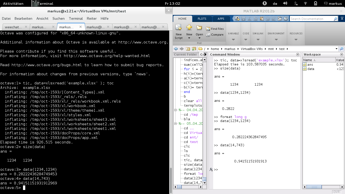 Das ist allerdings quick&dirty und hat für ein 1234x1234 Excel-Sheet auf meinem AMD E-450 @1.65GHz und 8GB RAM 926 Sekunden gebraucht. Nicht wirklich schneller, dafür braucht es kein Java, kein octave-io und kein octave-java.