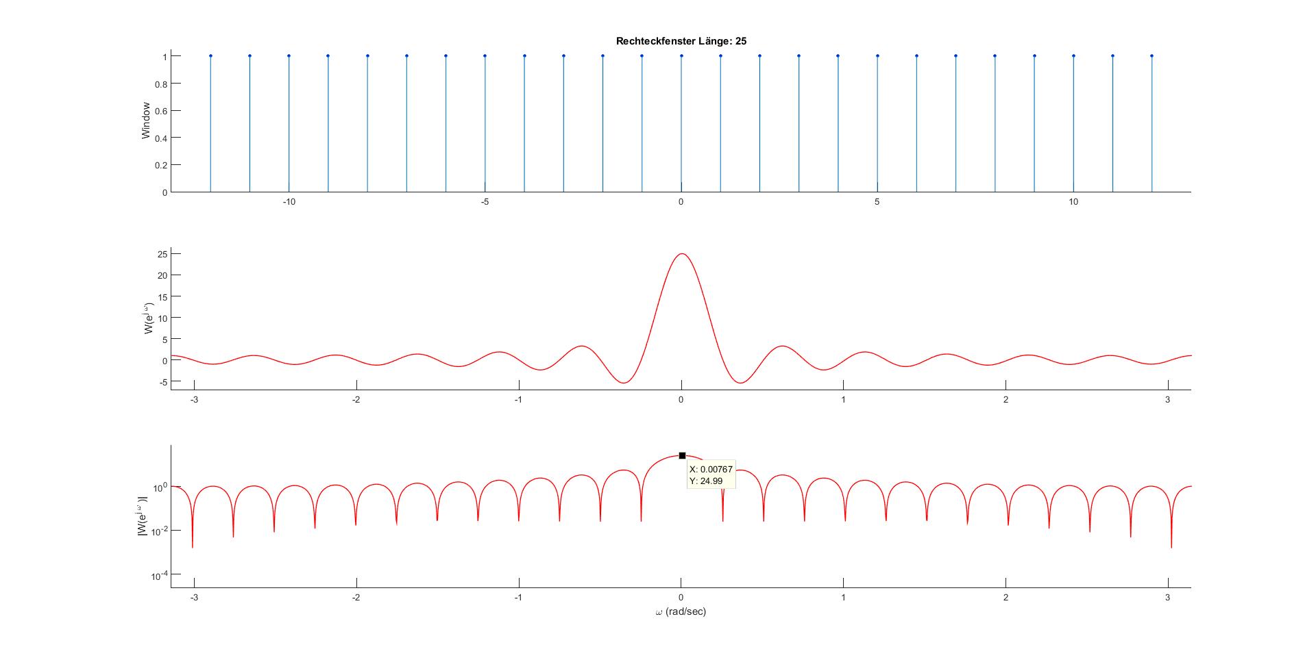 Es sieht auch alles so aus, wie es ausssehen muss. Problem ist jetzt Subplot Nummer 3. Und da die y-Achse. Wie zu sehen ist habe ich mit semilogy bereits eine logarithmische Skala eingefügt. Jetzt will ich aber, dass er mir die Skala in Dezibel (dB) darstellt. Heißt bei 10^0 soll eben nicht 10^0 sondern 20*log10(10^0) = 0 also 0 stehen. Ideal wäre dann noch wenn am Wert Y = 25 und Y=5,5 noch die entsprechende dB Werte also 27,9 dB und 14,8 dB steht.