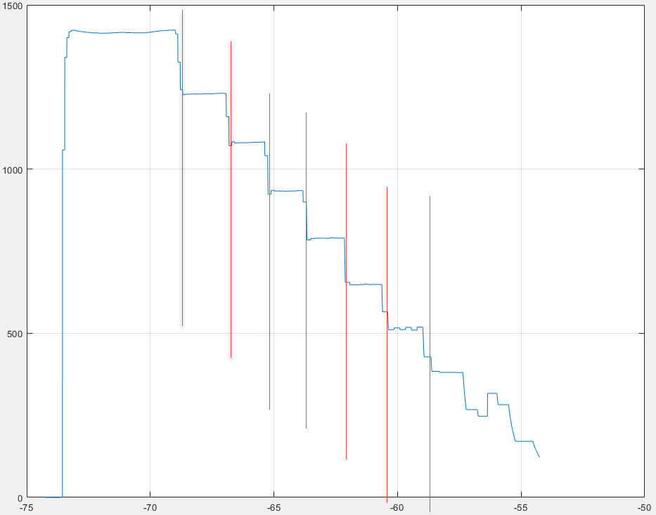 Ich brauche immer die Zeit für den Anfang und das Ende einer horizontalen Fläche. Wenn ich aber nur nach find(x>0) suche habe ich viel zu viele Punkte weil die Werte an diesen Stellen nicht zu 100% konstant verlaufen.