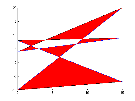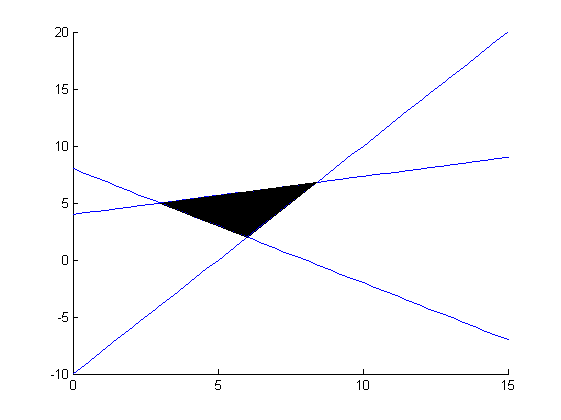 welches ist denn der zulässige Bereich? Das Fünfeck? Ebenso wie ich kann auch der patch-befehl nicht entscheiden, was eingefärbt werden soll. Du musst schon die Ecken des zulässigen Bereichs selbst angeben. Bei linearen Funktionen kann man ja die Schnittpunkte leicht ausrechnen. Du hast ja schon alle Geraden in der Form y = m*x + b. Du musst nur die (nicht redundanten) wesentlichen Geraden auswählen und paarweise gleichsetzen. Daraus erhältst Du die drei oder fünf Schnittpunkte (erst die x-Werte, durch Einsetzen dann die y-Werte). Mit patch kannst Du den richtigen Bereich dann einfärben.