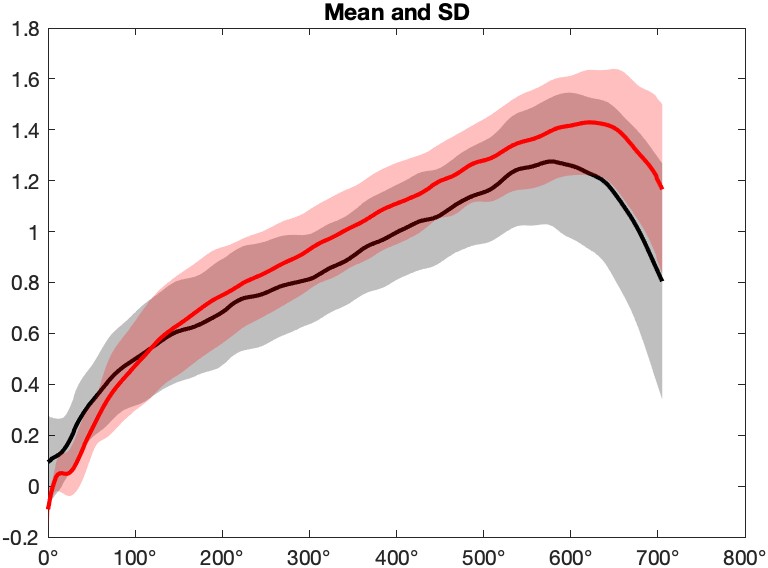 spm1d.plot.plot_meanSD(t1djkr30(2:end,:), 'color','r');