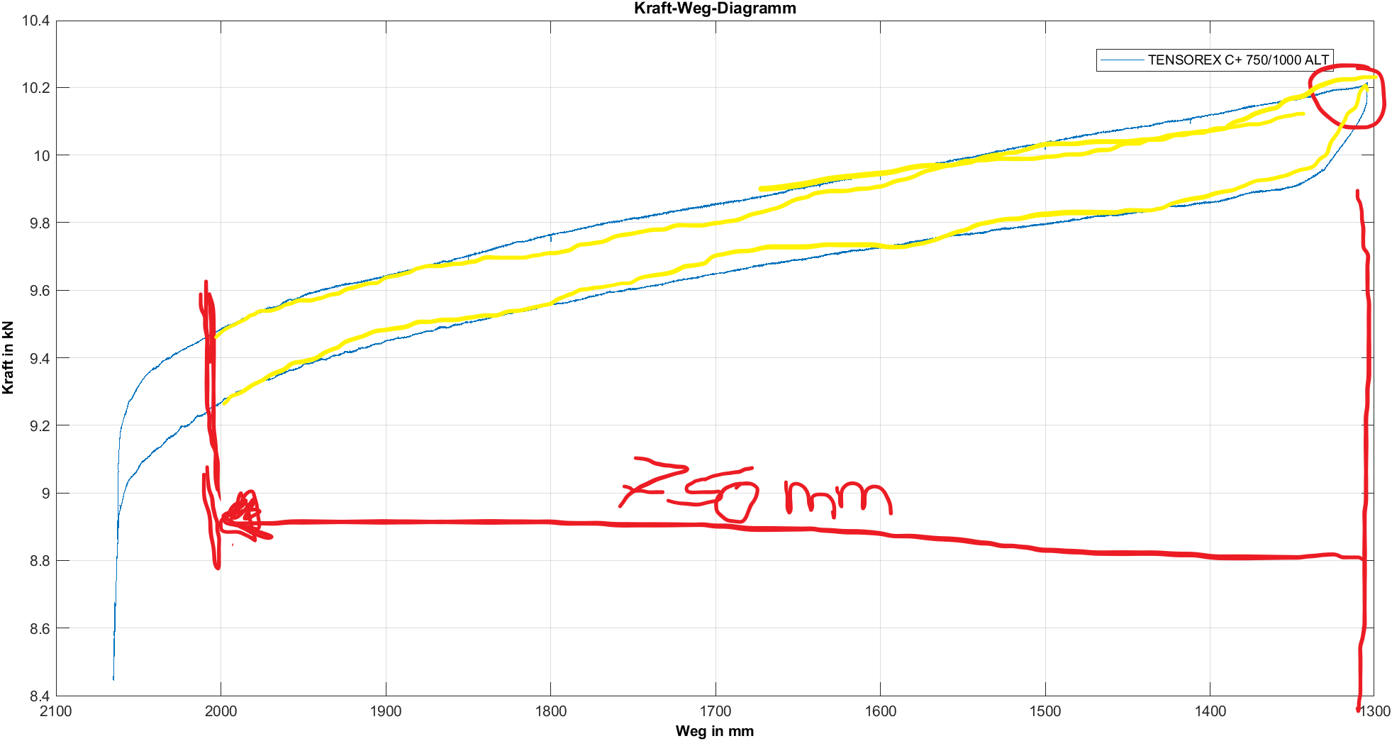 Ich habe eine Kennlinie, die das Verhältnis von Kraft (Y-Achse) zu Weg (X-Achse) darstellt und in einem gemeinsamen Hochpunkt beginnt.